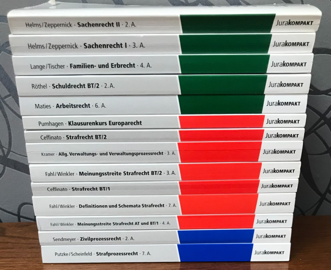 Die Bücher von Jurakompakt ersetzten natürlich kein vollwertiges Lehrbuch. Jedoch machen sie ihrem Namen alle Ehre. Sie sind klein, handlich und umfassen in groben Zügen den wichtigsten Inhalt. Aufgrund ihrer geringen Größe lassen sie sich optimal mitnehmen und erleichtern den Einstig in ein neues Rechtsgebiet. Es finden sich jedoch nicht nur die typischen Erklärungen zu den Rechtsgebieten in diesen Büchern, sondern auch kleine Fälle, Aufbauschemata und Übersichten sind darin zu finden. Anhand der kleinen Fälle kann man das vorher Erklärte gut nachvollziehen und der Einstieg in größere/ schwierigere Fälle wird dadurch erleichtert. Die Übersichten sorgen für ein gutes Nachvollziehen. Zudem befinden sich zum Ende des jeweiligen Kapitels Wiederholungsfragen. Meiner Meinung nach sind die Bücher von „Jurakompakt“ ein guter Einstieg um in ein neues Rechtsgebiet einzutauchen und es in groben Zügen zu verstehen- der erste Überblick wird garantiert. Durch den angewandten Schreibstil lassen sich die Bücher gut lesen und vermiesen einem nicht die Lust aufs Lernen.